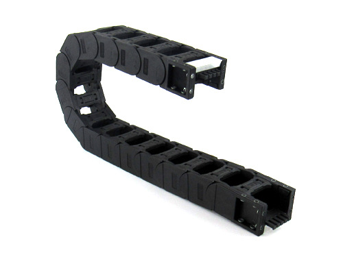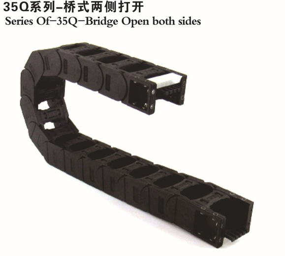 那第一個步驟的話有兩個方法,第一個方法是把需要內(nèi)置的電線電纜從拖鏈一頭直接穿進去,但是這種方法對于電線電纜使用比較長的情況下,使用起來不是特別的方便。特別是有一些電線電纜已經(jīng)安裝好了,或者電線電纜最前端有結(jié)這種情況,使用起來就完全不行。第二個方法是拿一把一字螺絲刀,以45度角斜插入拖鏈上側(cè)或下側(cè)檔片兩端的開啟孔中,用力向上翹,即可把檔片打開,然后把需要內(nèi)置的電線電纜直接平放于此內(nèi)即,再把檔片扣緊即可。